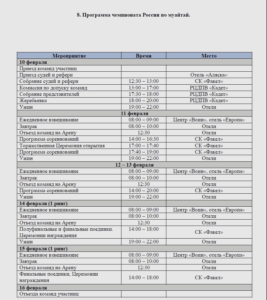 Чемпионат России по муайтай (17-40 лет мужчины и женщины) проводится в период с 09 по 16 февраля 2026 года в г. Ноябрьске.
